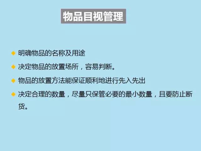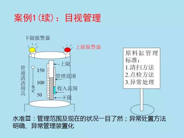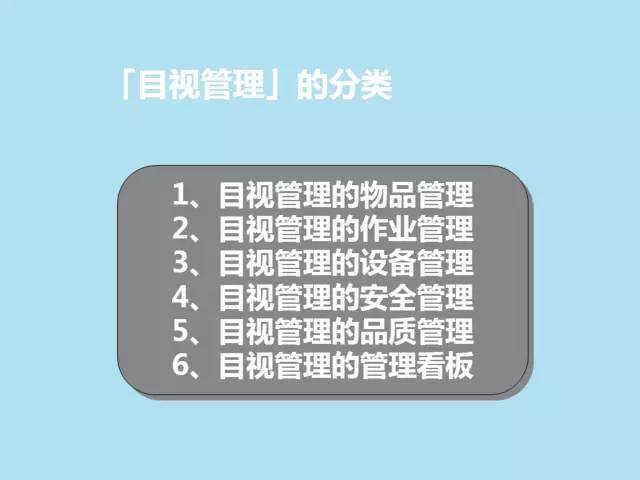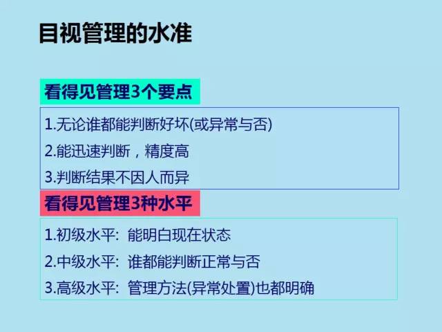 目视管理的基本定义:一目了然的管理,借助眼睛观察(目视)而能看出异常所在,让发生的问题点、异常、浪费等成为一目了然的状态,塑造一目了然的场所。目视管理的工具,如图表、看板、颜色、场所的区域规划等,完全取决于视觉,使人一目了然,防止错误发生