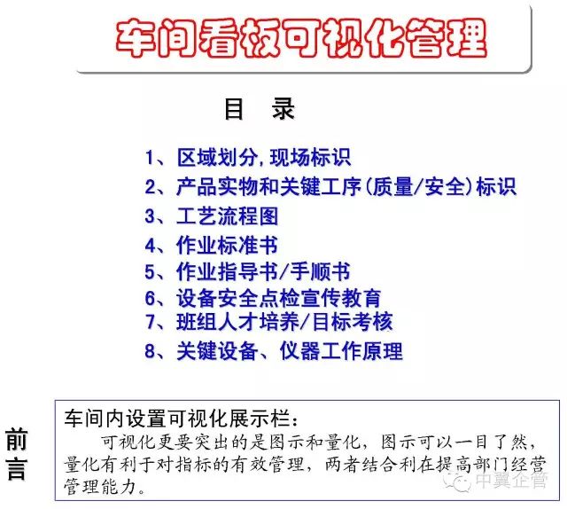可视化看板管理也叫目视化看板管理,目视化管理与看板管理是精益生产的两个重要工具。 目视化管理是利用形象直观且色彩适宜的各种视觉感知信息来组织现场生产活动,达到提高劳动生产率的 一种管理手段,也是一种利用视觉来进行管理的科学方法。它是一种以公开化和视觉显示为特征的管理方式。