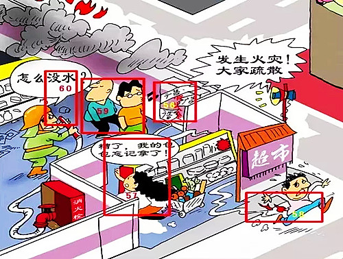 59.火灾引发浓烟时,应该弯腰并尽量用湿衣物保护头部和身体,捂住口鼻迅速逃离浓烟区。画中人物的姿势是错误的。